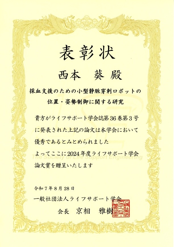 機械情報システム工学専攻科生(令和6年3月修了)の西本葵さんが投稿し、ライフサポート学会誌第36巻3号に掲載された「採血支援のための小型静脈穿刺ロボットの位置・姿勢制御に関する研究」というタイトルの論文が2024年度ライフサポート学会論文賞を受賞しました。