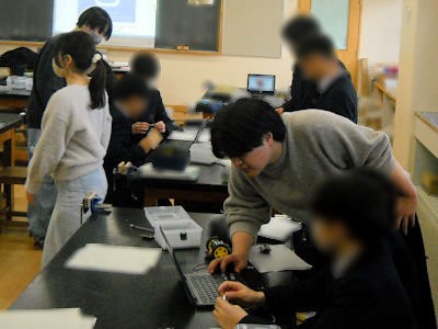 生徒の様子を確認しつつプログラミングを教える学生