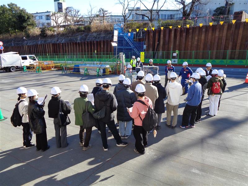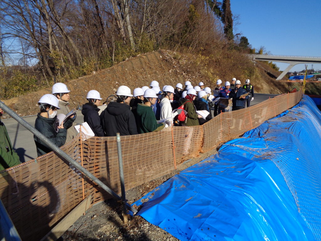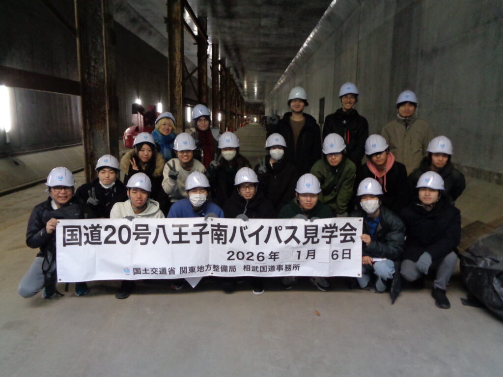 様々なご支援を「建設現場実装プロジェクト」からいただいていますが、ご支援の1つに建設現場見学会があり、今年度は令和8年1月6日火曜日に実施しました。本校の物質工学科の4年生19名が参加し、八王子市南部で工事進行中の国道20号八王子南バイパスの現場を見学しました。