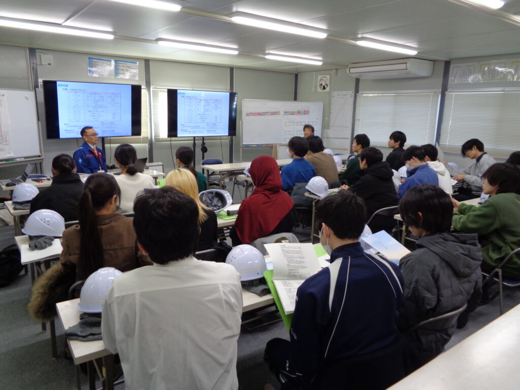 現場ではグループに分かれ見学しましたが、事前に配布された資料のほかにも詳細な資料が準備されており、丁寧な説明とともに学生は建設中のトンネルの施工方法などを確認しました。現場見学会後に工事業務と事務業務についての説明もあり、学生からは、「化学を専門としているため、現場を見るというと工場の現場に向かうことが多かったが、今回土木や建築に関連する工事現場に実際に立ち、施工方法など様々なことを教えていただきとても興味が湧いた。公務員についての説明も多く、興味を持った学生も手を伸ばしやすくしてくれる環境があると思った。」、「普段は関わることのない建設分野について知見を得る事が出来て良かった。アップサイクルに活かせるよう来週以降、今回の件を整理したいと考えた。」等の感想が寄せられました。