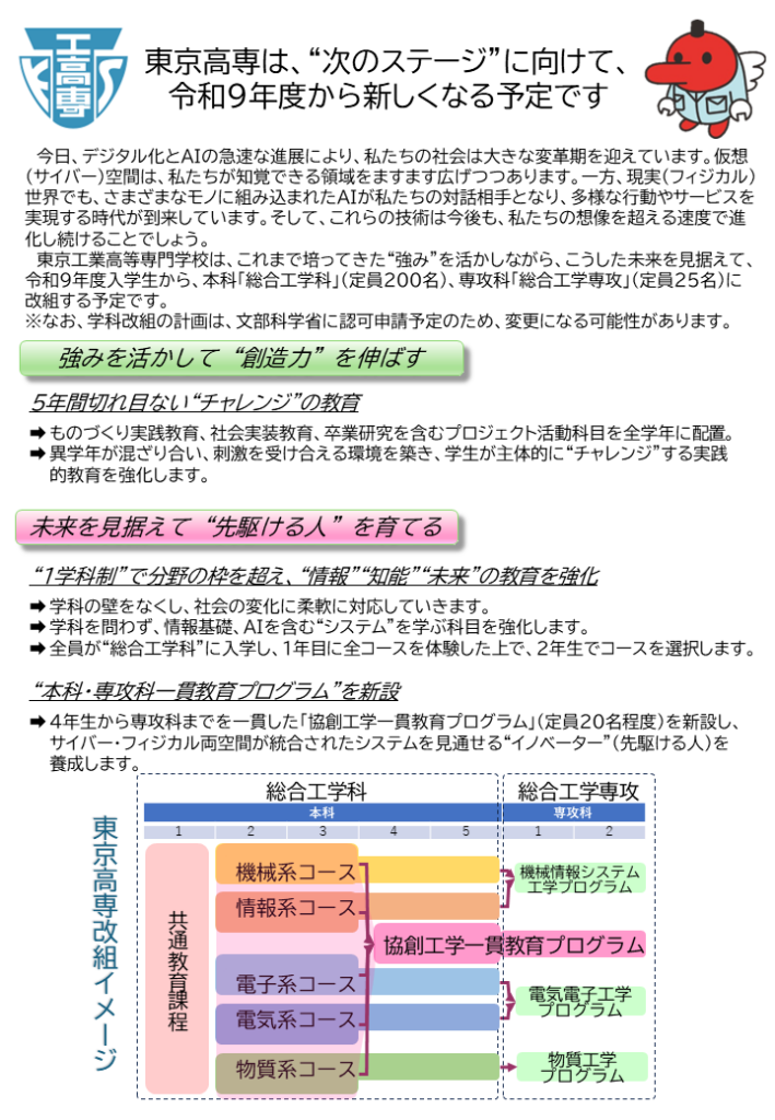 東京高専は、令和9年度(2027年度)入学生から改組を予定しています。